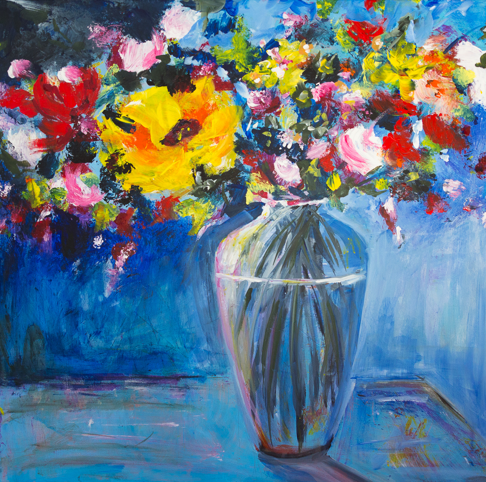 Acrylgemälde auf mehrfach grundierter 100 % Canvas-Baumwolle [380g/m²] auf Holz-Keilrahmen, 78cm x 78cm, Abstract, abstrakt, Acryl, acrylics, artbevo, bevo, Blumen, Blumenstillleben, contemporary art, Expressionism, Expressionismus, Gemälde, greeting card, Grusskarte, loose style, loosestyle, modern art, modernart, painting, postcard, poster, Postkarte, romantic, romantisch, Still Life, Stillleben, zeitgenoessisch