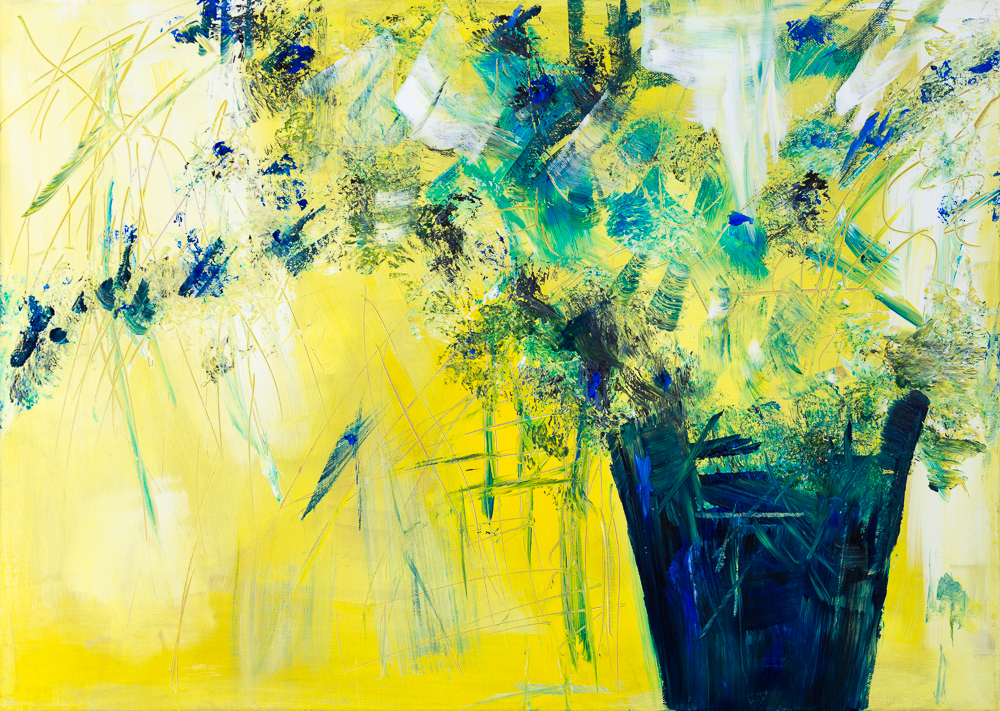 Blumenbouquet vor zitronen-gelbem Hintergrund - Flower bouquet in front of lemon-yellow background, Acrylics on canvas 50cm x 70 cm