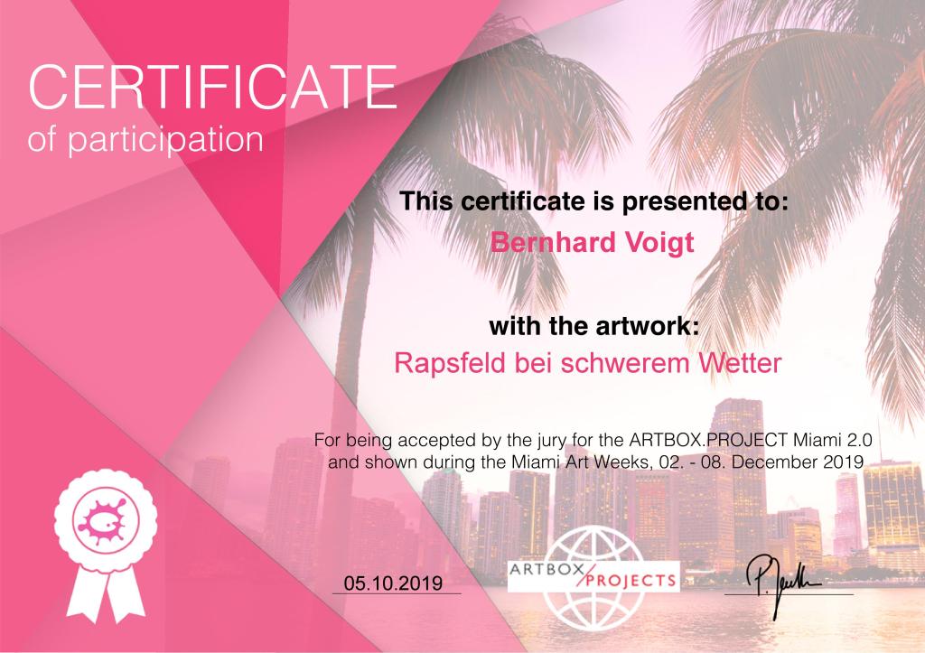 Das Bild wurde für das ARTBOX.PROJECT Miami 2.0 akzeptiert und wird während der Miami Art Weeks gezeigt. (*) Das ARTBOX.PROJECT Miami 2.0 findet vom 2. – 8. Dezember 2019 in Miami während der Art Basel Art Week in der Eduardo Lira Art Gallery an der 2nd Avenue in Wynwood, Miami, statt.