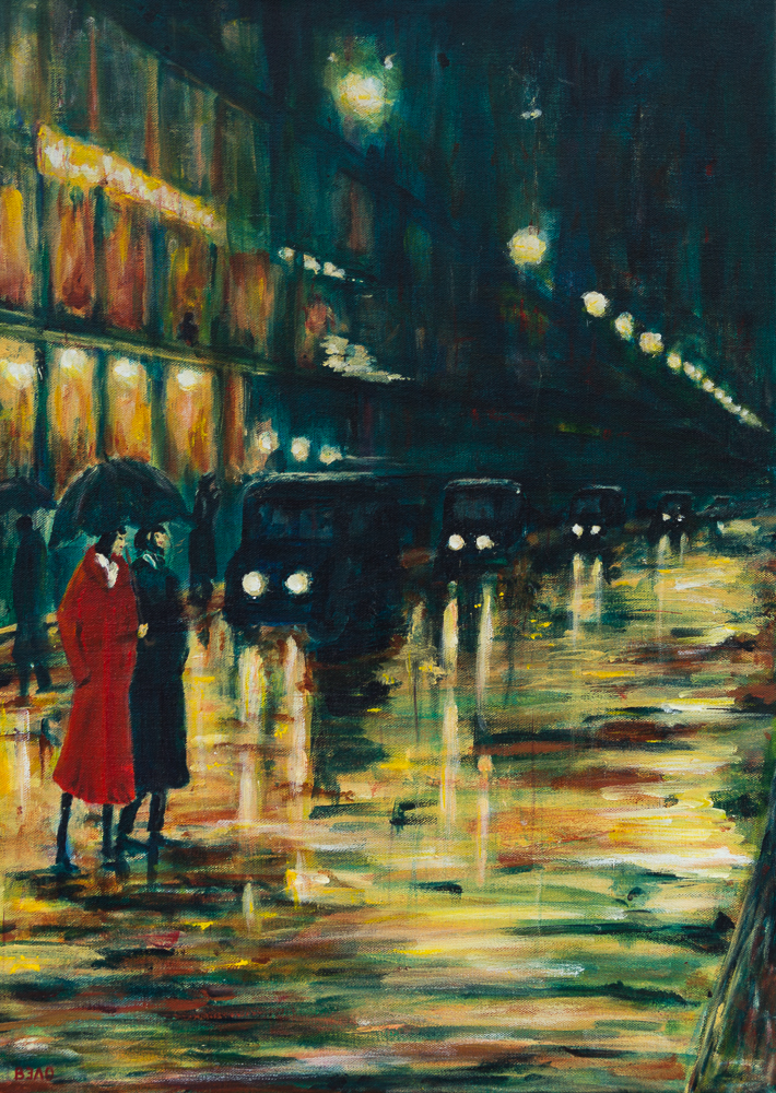 Das Bild entstand in diesem Jahr, nachdem ich das Original von Lesser Ury in einer Berliner Ausstellung sah. Es strahlte so viele Emotionen aus und gefiel mir auf den ersten Blick. In diesem Jahr begingen wir in der Nacht vom 9. zum 10. November den Fall der Berliner Mauer und gleichzeitig den Tag der Wiederkehr der Reichspogromnacht. Dies alles gemeinsam schien mir Anlass genug, dass Bild für mich neu erstehen zu lassen. Meine Bilder enthalten typischerweise farbliche Komplementärkontraste. So etablierte ich das Rot im Bild. Und ich nutzte keine Ölfarbe wie Ury, sondern Acrylfarben.