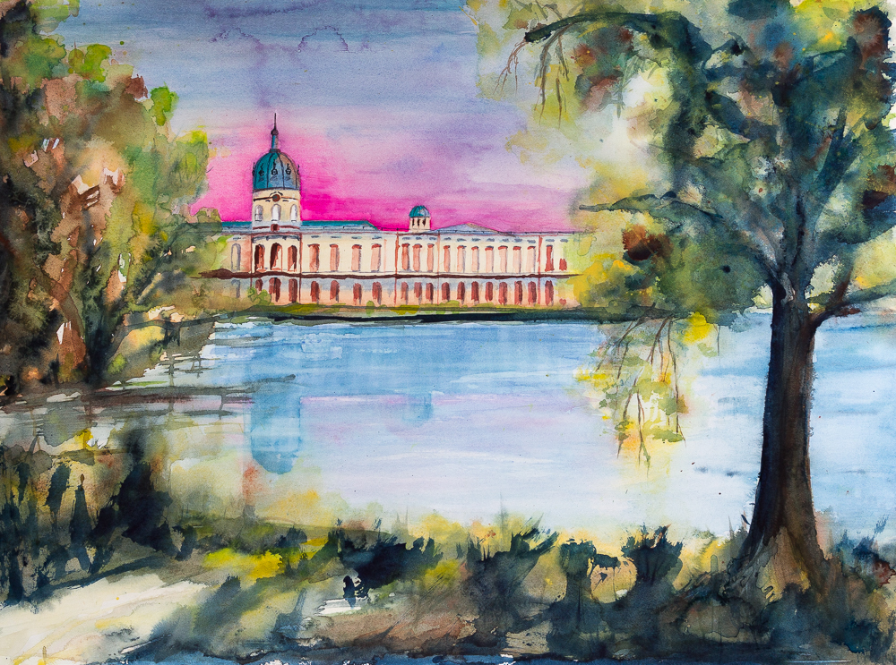 BerlinBlick IV – Schloss Charlottenburg, Variante I (Aquarell, Bütten, Lanaquarelle, matt – 56cm x 76cm) Das Schloss in Berlin Charlottenburg mit Blick vom Park.