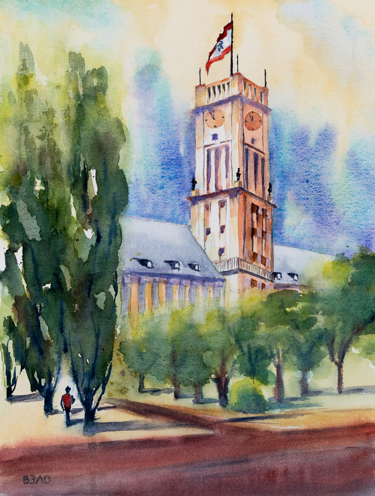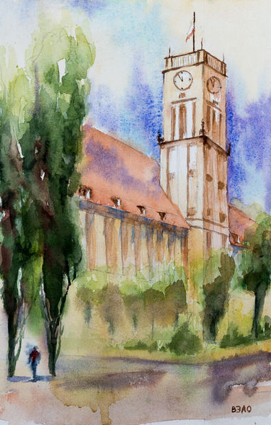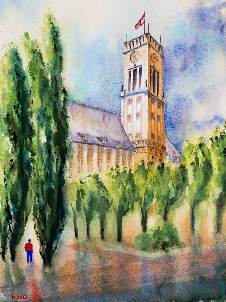 BerlinView #8 – Town Hall Schöneberg, variation #2 (Watercolor, on mould-made paper, Centenaire – 11,9in x 15,8in) The town hall in Berlin Schöneberg is the town hall for the district Tempelhof-Schöneberg. From 1949 to 1993 the Berlin House of Representatives met here. From 1949 to 1991 it was the office for the Mayor of Berlin. The handover of the Liberty Bell, which is housed in the town hall, was on 21 October 1950. It is the largest bell in Berlin not used for religious or ritual purposes. It sounds in the striking tone e° and weighs 10,206 kg.
